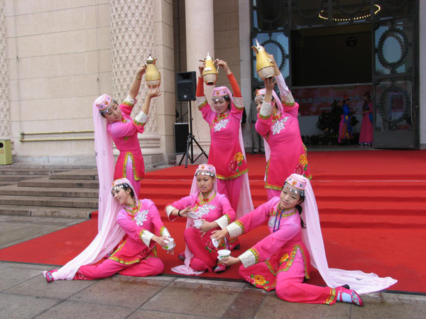 哲茲白:東鄉族穆夫提教派中流傳著一種歷史悠久的舞蹈叫“哲茲白”,這種舞蹈多在宗教儀式中表演,舞者均為男子,動作以誦經的節奏為準。主要動作為:雙手前后甩動兩下,同時腳下動兩步,然后雙手在胸前交替拍胸,這時一腿稍彎曲,另一腿向前伸出。舞蹈特點詼諧、幽默、灑脫。