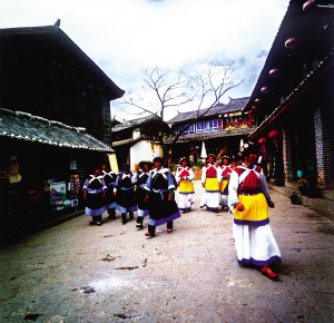 束河、沙河古村鎮到處都是納西族的田園式庭院。大門的裝飾與圍墻和屋脊的裝飾相呼應,庭院里種了許多植物,高的果樹,矮的花草,就像一個小花園,和田間彌漫著的野薔薇都散發著令人陶醉的幽香。