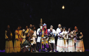 話劇《巴交龍布》由著名導演查麗芳擔綱總導演。為了實現戲劇擅長的表達方式,該劇把與巴交龍布同行的騾子作了擬人化處理,將這對“難兄難弟”的經歷作為貫穿全劇的一條主情節線。在雙方的對話交鋒中,既有喜劇的幽默,又有正劇的嚴肅。同時,納西族傳統文化也得到了豐富的體現。劇中,不僅有盛大的納西族婚禮、神圣的東巴祭祀儀式、歡快的納西族歌舞,還有對納西族信守承諾、吃苦奉獻等民族精神的彰顯。
