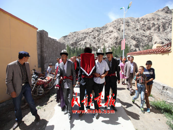 不一會兒,外面熱鬧聲一片。原來是迎親隊伍來了!只見新郎用一塊紅布遮住了臉,在眾人的簇擁下,緩慢前行。新郎的左右站了三位伴郎,他們一邊走,一邊唱起柯爾克孜族最具代表性的民間口頭文學“約隆歌”。每走幾步,新郎都會伴著歌聲的旋律和手勢鞠一下躬。新郎和伴郎腰間各系有一塊紅布,他們邊走,后面幾個新娘家的姐妹就要不時抓住他們腰間的紅布,往后拉一下,盡量不讓他們走得太快。其原因是希望他們多唱歌、多鞠躬,以表達對女方的尊重。