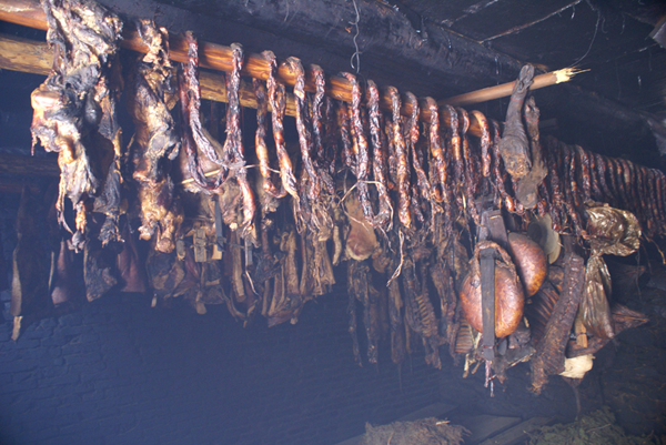 羌族通常一年宰殺一次豬,所以除了剛剛宰殺的那幾天能吃到鮮肉外,平時很少食用。每年冬月殺豬后均將豬肉切割、抹鹽、煙熏,腌制成臘肉。豬油也在抹鹽后,用兩個木夾夾壓成餅狀,隨吃隨煉。同時也取部分瘦肉切碎,拌上作料,灌入洗凈的豬小腸內制成香腸。羌族還常把新鮮的豬骨頭砍成小塊,然后抹上鹽、花椒、姜、蒜、蔥等,放進豬的胃囊里,扎緊、風干,掛在火塘上用煙熏,制成豬肚骨頭,久存不壞。