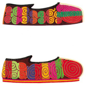 羌族男女皆穿羊皮坎肩和寬大袍衫、系腰帶,腳穿云云鞋,女子系繡花圍裙和飄帶,戴繡花頭帕。其中刺繡精美的云云鞋可以代表羌族刺繡的藝術(shù)水平,羊角花紋是云云鞋的主要紋飾,因其線條流暢如行云,故得名云云鞋。其實(shí),這與羌人崇拜天神的信仰有關(guān),天神就居住在高高的云空之中。此外,羊角紋還體現(xiàn)了羌人曾以羊?yàn)閳D騰的古老信仰。關(guān)于云云鞋還有個(gè)傳說:相傳,一個(gè)生活在湖泊中的鯉魚仙子看見放牧的羌族少年赤腳,十分心疼,于是摘下一朵白云彩,折來一束羊角花,做成繡鞋相贈(zèng)。后來他們相愛了,成了一對(duì)最幸福的人。從此這種有著羊角花紋的云云鞋就成了愛情的象征,羌族民間云云鞋也多作為情感的信物贈(zèng)送意中人。千百年來,羌族刺繡就這么把美麗點(diǎn)綴在生活中,比傳說和記憶更生動(dòng)美好。