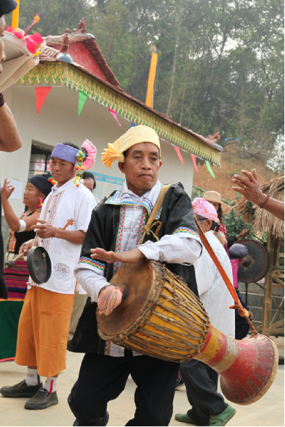 新年到時,漥墨寨的布朗族人們事先就發出通知,邀請外寨人來一起“跳歌”,在間隙時間也常常有兩寨人集體賽唱歌,誰輸了誰就得出豬頭請客,在一陣生動詼諧的對唱以后,人們又繼續“跳歌”,往往通宵不散,難解難分。
