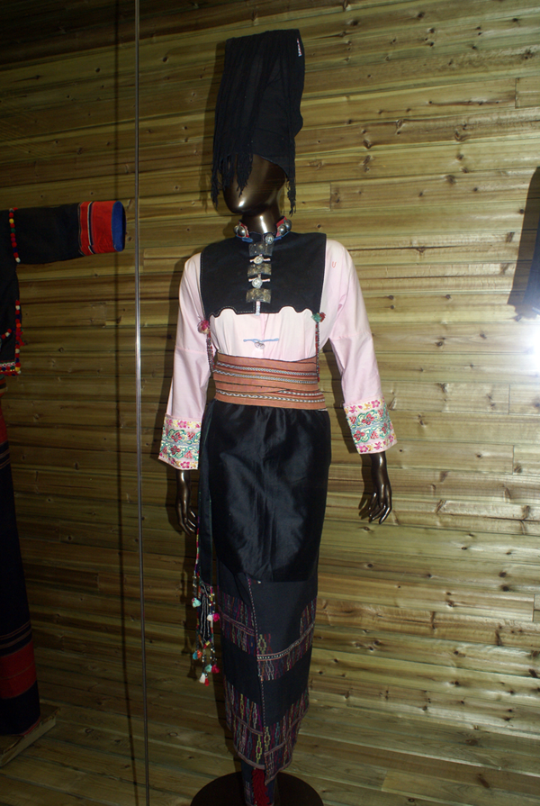 男子穿對襟上衣,下著黑褲,斜背“筒帕”,喜歡在胸前戴朵紅絲線結成的菊花。未婚男子戴白包頭,已婚男子戴藏青色包頭,青壯年在腦后留一尺多長的包布,有隨身佩帶刀的習俗,其中“戶撒刀”最為有名。