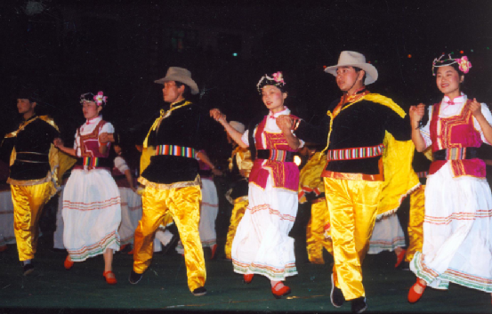 普米族的民間娛樂舞蹈,普遍具有歌、舞、樂三位一體的特點。舞蹈形式正如普米族民歌所唱的:“如金線把珍珠穿成一串,手拉手跳成十五的月亮。”娛樂舞蹈全是手拉手轉圓圈的舞蹈形式。人們挽手而跳,伴以高亢洪亮、情感激越的唱詞。特別是普米族婦女雪白的長裙隨舞步輕盈飄旋,似白鷺翻飛,正如《打跳歌》中所唱的:“笛聲不停莫歇腳,舞場上沒有陡巖子,腳底板下沒有刺,跳它個地動山也搖。”在喜慶的集會之夜,歡快的娛樂性舞蹈,往往一跳就是通宵達旦。跳鍋莊是普米族傳統的舞跳形式,這種舞蹈不受時間空間的限制,只要一支竹笛或葫蘆笙,有一塊空地即可進行,少則三五人,多則數百人。一般總是在傍晚,在院內或場壩上舉行。跳舞時,總要在中間燃起一堆火,與室內的鍋莊相似,所以稱之為鍋莊舞。鍋樁內容很豐富,從古代的游牧、狩獵、紡織到今天的趕街、慶豐收、烤酒等都有反映。流行的曲調有《放單調》《出山》《獅子舞》等等。現在,鍋莊舞已發展成為集唱詞、曲調、舞蹈、音樂于一體的綜合性歌舞藝術。