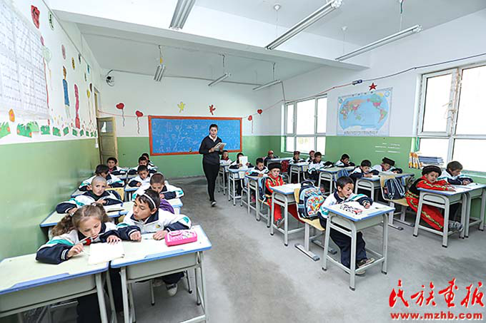 帕米爾高原上的塔吉克族孩子們在中國建設銀行捐贈的希望小學的明亮教室里上課(張建輝 攝影)
