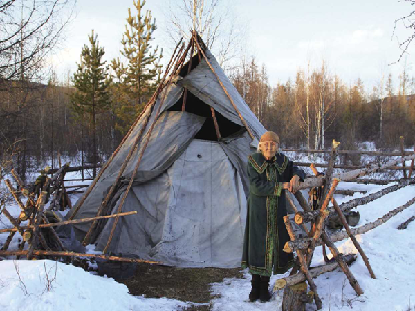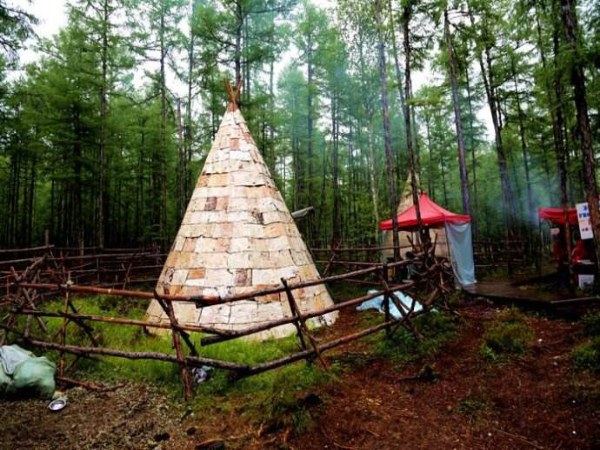 撮羅子的選址,是在地勢較高、陽光能照射到而且水和柴草就近可取的平坦之處。其蓋造方法,是用三五根約碗口粗細上有枝杈的木桿,相互交合搭成上聚下開的骨架,然后再用30根左右木桿搭在骨架之間捆綁固定,在南面(或東面)留出門,即基本成型。木桿搭起的只是“屋架”,外面還要覆蓋才能遮風擋雨。按照季節的不同,分別用樺樹皮、草簾子和犴、狍等獸皮,做成自上而下一層壓一層的圍子,綁在木桿上,門簾則夏用草或樹條編,冬用狍皮做成。