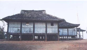 鎮康地區若干小家庭同住一幢房子,房內中間有寬敞的走道,兩旁為各小家庭住室,間壁而居,各有火塘,所以竹樓較大,有的占地近四百平方米。這種干欄式長方形大屋居住形式源于過去德昂族地區仍保留父系大家族社會組織,也就是說有血緣關系的后代都共同居住在一所大房子內,房屋的大小要依據家庭成員多少而定。雖然隨著社會的發展和大家庭生活方式的改變而瓦解消失,但在解放初期還能看到它們的遺址或縮小了的原型。