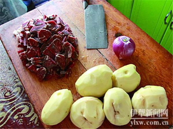 下午4點,陽光透過窗子灑進買斯胡旦的家。拜列西做好了。布置好茶桌、餐碟,買斯胡旦倒茶,姐姐將拜列西的頂蓋掀開,濃香的熱氣撲騰出來。她把頂蓋切塊,同時用勺子舀出餡放在面餅上,分給大家。咬一口面餅,酥脆,吃一口餡料,土豆松軟,肉塊噴香。一份下肚,意猶未盡。