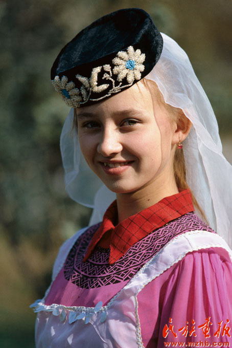 塔塔爾族的婚俗別具一格。按塔塔爾人的傳統習慣,婚禮在新娘家舉行,即先把新郎“嫁”出去,然后再“娶”回來。婚姻過程主要經歷提親、相親、訂婚、納聘、嫁新郎、娶新娘六個過程(塔塔爾族少女。引自民族畫報)。