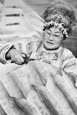 尤文鳳介紹,魚皮畫因風格獨特,很受市場歡迎,而它的很多工序其實都來源于魚皮衣制作技藝。尤文鳳對魚皮畫的制作是從2000年開始的。“母親曾和我談起,以前過節時,赫哲人會在窗戶上貼上四方菱形的窗紙,紙上描繪著花鳥魚蟲以及龍鳳等吉祥圖案。后來我根據和母親聊天的內容,一邊回憶、一邊復原,就做成了現在的魚皮畫。”尤文鳳說。