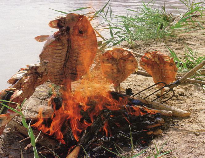 赫哲族居住的三江流域,河流縱橫交錯,群山環繞,蘊藏著極為豐富的漁獵資源。長期以漁獵為生的赫哲族人民,在征服自然、改造自然的歷史發展過程中形成了具有濃郁民族特色和地域特色的傳統飲食文化。其傳統飲食以漁獵產品為主,魚干獸肉,家家堆積為糧。這與農牧民族相比,別具特色。