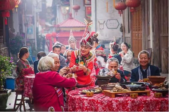 2.畬族婚嫁:婚禮的特色較多。迎親隊伍到村時,嫁方村上女性拿杉木枝欄路,表示晚上要對歌;到中堂時,嫁方請四位男子與迎親隊伍中四人相對作揖,此儀式叫“拾田螺”,表示歡迎;中餐由嫁方請迎親隊伍,媒人就坐中堂席首位,叫“落腳酒”;晚餐由娶方請嫁方親戚朋友,舅公就坐首席,叫請“大酒”;午后,赤郎舉行“借鍋”儀式,赤郎端點紅燭放有一刀肉和兩塊豆腐的米篩向灶神作揖后,用謎語念借所有的炊具,姑嫂們把能藏的炊具都藏起來,念不到就不拿出來,要全部重借,“借鍋”意為娶方借嫁方炊具宴請客人。借好之后,赤郎要殺娶方家挑來的一只公雞用以嫁方“請祖公”,殺雞時,規定血不許滴到地上,滴一滴地上罰一碗酒;宴席中途嫁方女歌手會起歌頭找赤郎對歌。畬族婚禮的又一個特點是,新娘夜行嫁,卯時進夫家門。行嫁時有牛在前頭踏路,意為新娘一切都要新的,牛踏過的路為新路。以往嫁妝有鋤頭、斗笠、棕衣、線簍、火籠等,體現了畬族婦女熱愛勞動。