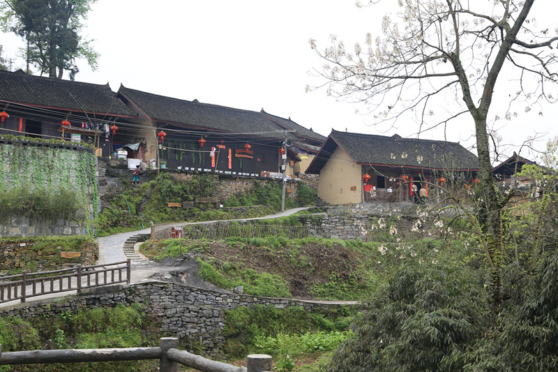 梨子寨共有28戶人家,當年全寨烏黑破落的房屋如今全部修繕一新,并保持了苗族民居青瓦、木板、竹籬、黃泥墻的特色,寨子里的泥土路也鋪上了青石板,屋頂、院壩、石階、游道及田頭落滿了白色梨花花瓣。穿青衣包頭帕的苗族女子在田間鋤地、拔草,青山環抱的梨子寨無比清幽。