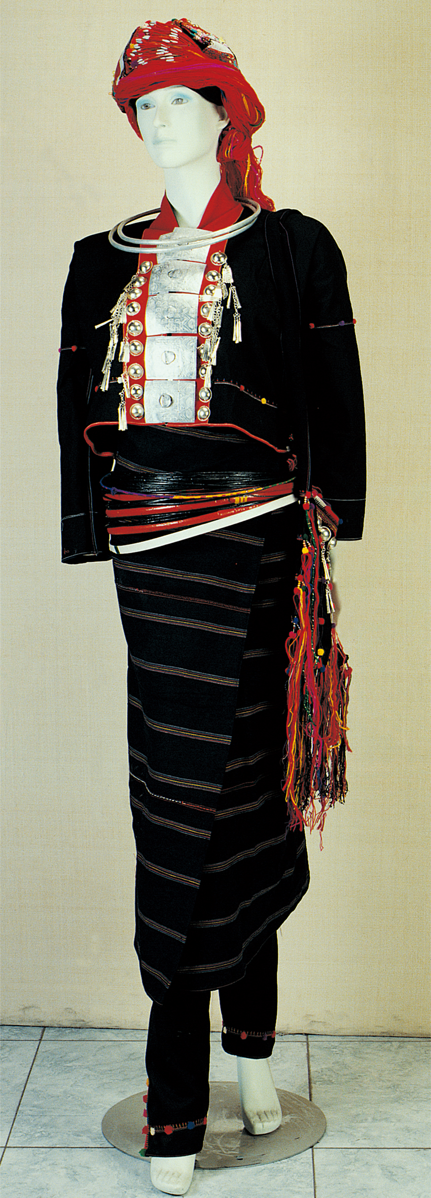 “藤篾腰箍”最醒目的是套在婦女腰間的藤蔑圈,又被稱為“腰箍”。早在德昂族的創(chuàng)世古歌中,就有“腰上箍著藤圈的姑娘靠得住”的說法,德昂族通常把佩戴腰箍的數(shù)量作為衡量姑娘心靈手巧的標志。從清代,德昂族從古代蒲人中分化出來,劉毓坷在光緒年間的《永昌府志》卷五十七順寧府記載,崩龍族人“女以尖布套頭,以藤蔑圈纏腰,漆齒紋身”。而現(xiàn)在其他民族以藤蔑圈纏腰的習俗早已不復(fù)存在,只有德昂族的這一習俗延續(xù)至今(圖為德昂族傳統(tǒng)銀牌扣竹篾腰箍女服,中央民族大學民族博物館館藏)。