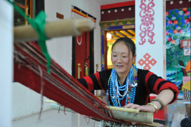 在自治區群藝館的展出現場,除卻這些光鮮亮麗的民族服裝之外,另一個特殊群體也同樣吸引了眾人的目光,他們便是從西藏各個地區前來為觀眾展示藏裝制作工藝的民間手工藝人。他們有的在織布,有的在裁剪,有的在穿針引線做靴子、縫制衣服,這些數以萬計的、平凡而又偉大的民間手工藝人們,用他們幾十年如一日的堅守,默默地承擔著民族文化創新與傳承的歷史使命。