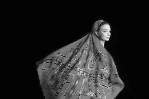 星空密碼絲巾上的紋樣圖形是和上古時代的文明聯系在一起的。傳說中的“洛書”即“九宮圖”的原型,就保留在古老的苗繡服裝上。中國造型文明的起始源于星相學的認知。關于這些傳說,在古老的苗繡中找到了印證與答案。設計沿用古老繡片上保留下來的這些神秘符號,通過再演繹,讓古老的智慧穿越時空,熠熠生輝。