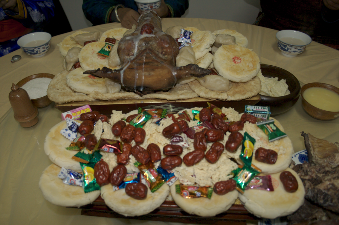 全羊席,又稱整羊席(蒙古語為“布禾勒”或“酥斯”),是蒙古人招待貴賓的傳統(tǒng)佳肴,也是蒙古民族最古老、最隆重的一道宴席,一般只在盛大宴會、隆重集會、舉行婚禮或接待高級貴賓時擺設(shè)。將整羊加工后擺在長方形的大木盤里,像一只臥著的羊,肉味鮮美,香飄滿堂。賓客在進(jìn)餐前,還要舉行一定的儀式,高唱贊歌,朗誦獻(xiàn)整羊祝詞等。據(jù)文獻(xiàn)記載,成吉思汗曾設(shè)過全羊宴。忽必烈登基時,也設(shè)全羊宴祭神祇、待賓客。至清代全羊宴更加盛行,現(xiàn)已成為蒙古民族風(fēng)格接待貴賓的名貴菜肴,馳名中外。