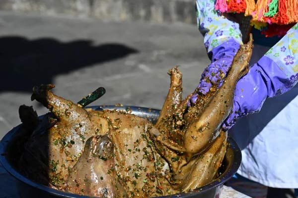 腌漬的時間越長,調料越能入味,揉好鹵汁,還要腌制個把小時。房屋后面,也是一派繁忙的景象,挖土坑,摔膠泥,大家都在為這一道隆重的美食做著準備工作。全羊用野芭蕉葉、草果葉或大粽葉、大竹葉捆裹停當,用膠泥裹糊嚴實,挖一土坑,先放入一堆柴火燒起,把土坑徹底燒熱,再把土包羊放到土坑里,土包羊上下左右堆放滿柴火開始燒烤,約2小時后,木柴全部化為灰燼,然后刨土覆蓋嚴嚴實實,不能透氣絲毫。