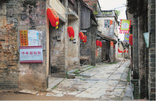 千年老街自北向南,寬約4米、長約300米,青石板路面。沿街多為典型的嶺南風格建筑,二層騎樓,房屋寬敞深長,一樓為鋪,二樓為居,前為店,后為廚。天井頂面多設明瓦數塊,以取日光照射,木梯扶手、門窗雕刻的粗細花紋無聲地證明它們曾經的風采。看得出當年舊街果然是繁華過的,有飯館,有劇院,有酒肆,有客棧,有百貨,街道排水、布局都很合理,有的街道至今在門前仍有留有水道。