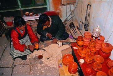 木碗的來源,一是西藏自己生產的,還有一種是云南迪慶生產的,都是從西藏的市場上交換或購買的。西藏林芝地區的朗縣、察隅,山南地區的加查、隆子、錯那,阿里地區的噶爾等地均產木碗。其中尤以錯那生產的“察牙”木碗和噶爾生產的“堆旭”木碗最負盛名。以上木碗的原料選擇樹根或樹瘤車制而成,選料之講究,做工之精細,使好木碗的花紋各異,或磷火紋,或豬鬃紋,或貓頭鷹眼紋,這些木碗都很名貴,與普通木碗之間的價格也很懸殊,一個上等木碗價值10頭牦牛,一般人家是不敢問津的,但也盡量想方設法弄個像樣的,以慰平生。
