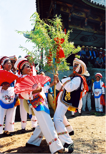 “繞三靈”活動的特點,除了向本主神靈祈求風調雨順的內容之外,主要在于其歌舞活動所表現的男女情愛無所顧忌,放達不拘。每個歌舞隊列領頭者均為男女巫二人,他們以一手共執一株齊人高的樹枝,另一手分別揮舞牦牛尾和花手巾,邊舞邊唱,引領著隊伍緩緩前行。樹枝上掛著紅綢系著的葫蘆,據說葫蘆象征母腹,紅綢象征陰血。他們口唱的調子稱“活恩枯”直譯為“花柳曲”,一唱一和,幽默風趣。其后的歌舞隊列,唱的也都是充滿艷情的調子,跳的是霸王鞭和八角鼓舞,舞姿多有男女背靠背、心合心、腳勾腳等形式,無拘無束地表達著熾熱的情感。