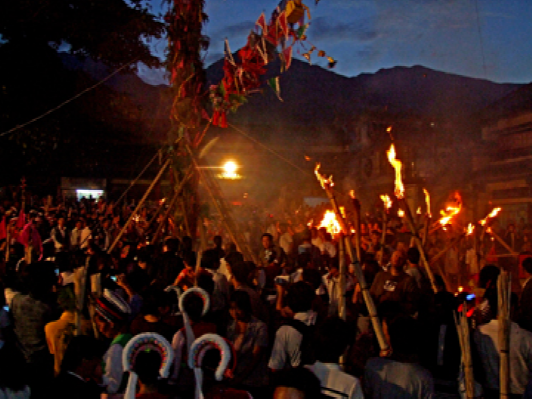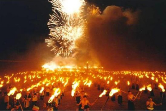 火把節(jié),白語又稱:“富旺物”(六月當(dāng)中最大的一天)、“薪燬架”(薪火節(jié))、“樠燈架”(松明子節(jié)),漢語稱為“星回節(jié)”,一般通稱“火把節(jié)”,是白族火崇拜的節(jié)日,時在農(nóng)歷六月二十五日。