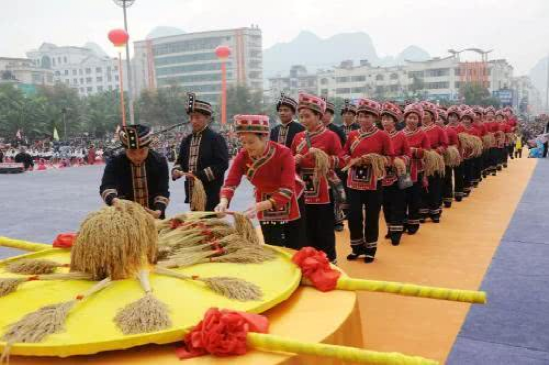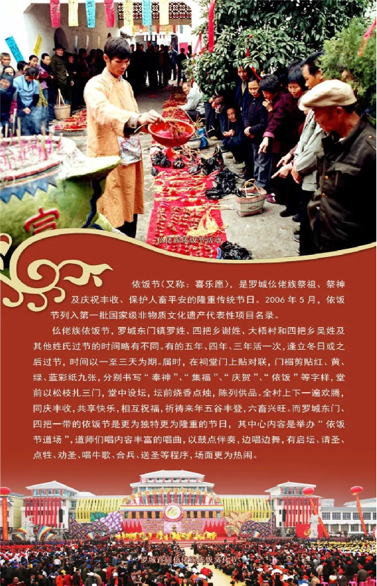 依飯節,仫佬挨語叫“做依飯”、“敬依飯公爺”、“還祖選愿”、“喜樂愿”,意為“向祖先還愿”。依飯節是仫佬族祈神保佑豐收、人丁安泰的傳統節日,帶有強烈的感恩和祝愿色彩。每逢辰且末之年的冬至前后舉行,持續3~5天。仫佬族以血緣聚居,同姓一個宗族,同一個宗族的分支謂之“冬”。過依飯節,一般以“冬”為單位輪流備辦,需準備的物品有豬、羊、雞、鴨、魚、米、酒等。