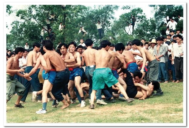 待賀節隊回到主會場,花炮節正式開始,首先是舞獅表演,接著蘆笙、卡羅舞表演,斗馬、斗鳥以及賽馬等活動各自展開。這些活動告一段落后,最精彩的節目——搶花炮開始了,人們像潮水般涌向主席臺前,圍成一個幾十個平方米的空地作搶花炮場地。搶花炮分一、二、三等,搶三次,得勝者,抬著漂亮的花炮頭及獎品興高采烈地回村了。