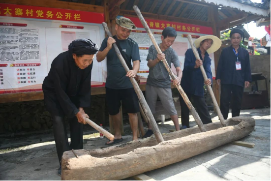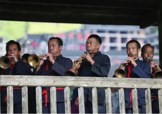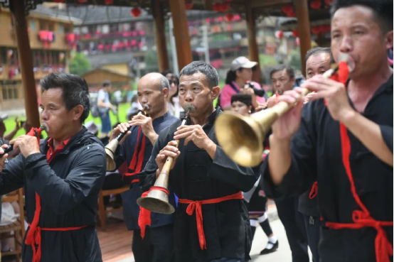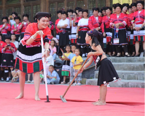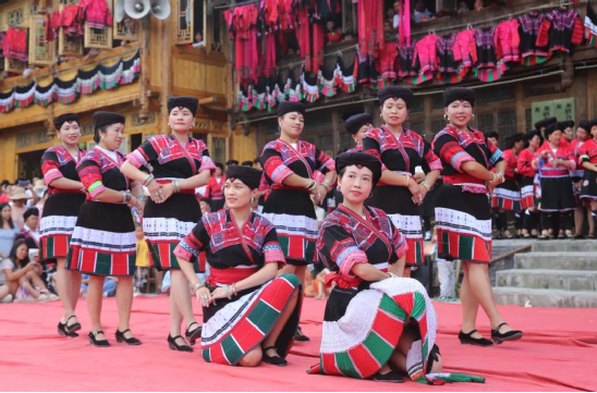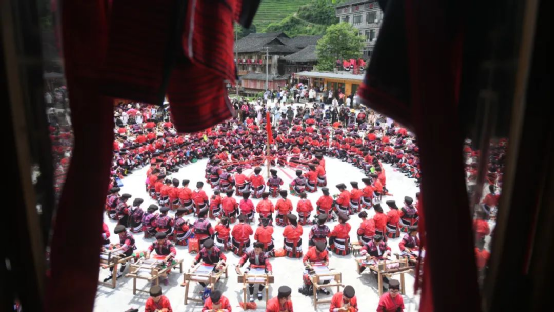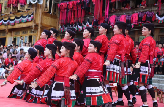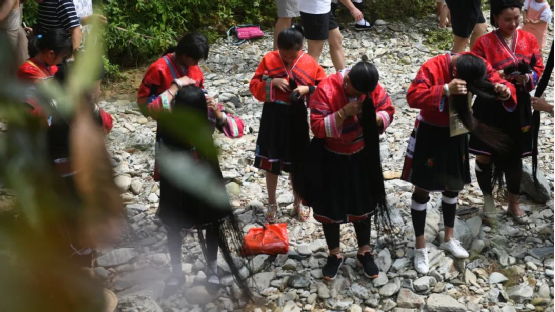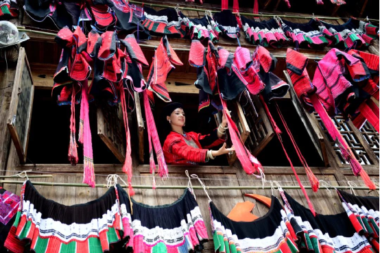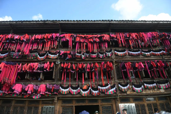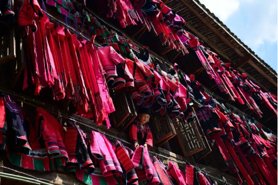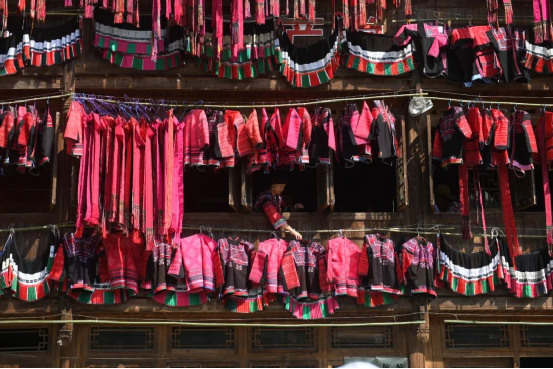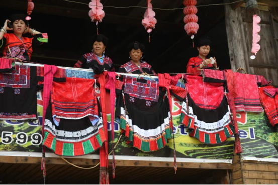 這一天,寨子里賓客盈門熱鬧異常,嫁出去的女兒和在外寨入贅的兒子都要挑著鴨子、酒和禮品,背著小孩回家吃團(tuán)圓飯,家家戶戶包粽子過大節(jié)。紅瑤姑娘和嫂子們,紛紛推開窗戶,拿出民族盛裝一件件掛在窗外晾曬,整個寨子掛滿了紅衣服,顯得格外鮮艷奪目。