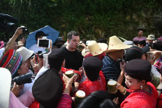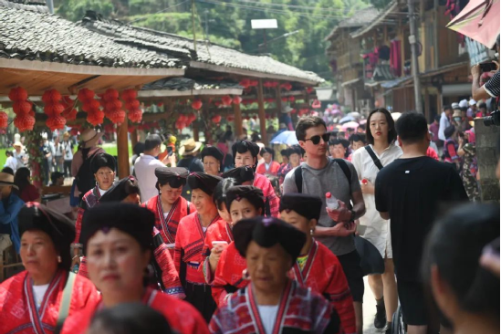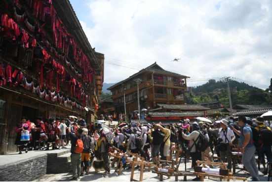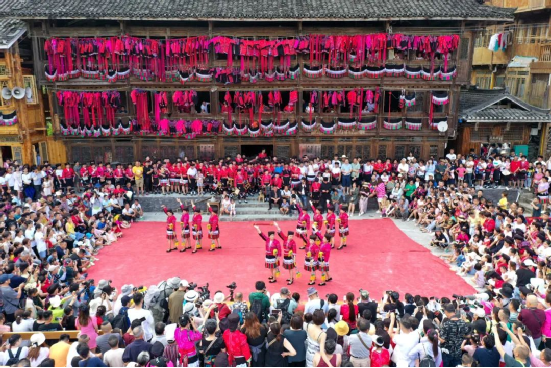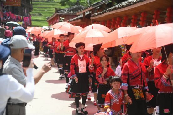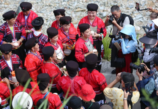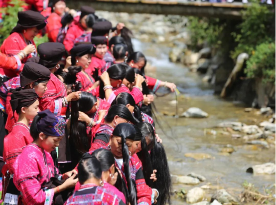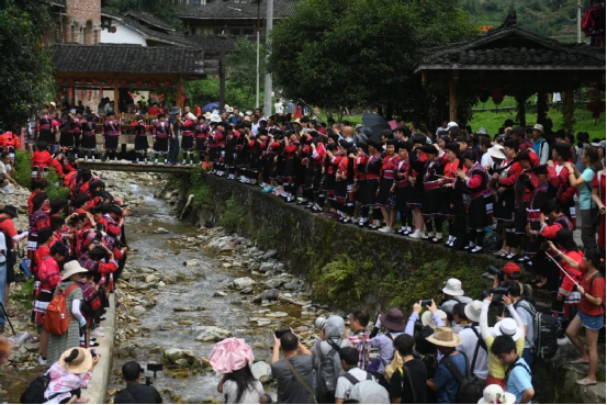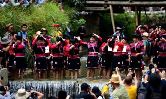 曬衣節(jié)當(dāng)天還進(jìn)行了嗩吶鑼鼓迎賓、瑤嫂長發(fā)梳妝展示、“抬金狗”送祝福、紅瑤服飾加工展示、紅瑤集體婚禮等活動,豐富多彩的民俗文化、濃郁的民族風(fēng)情,讓各地游客流連忘返。