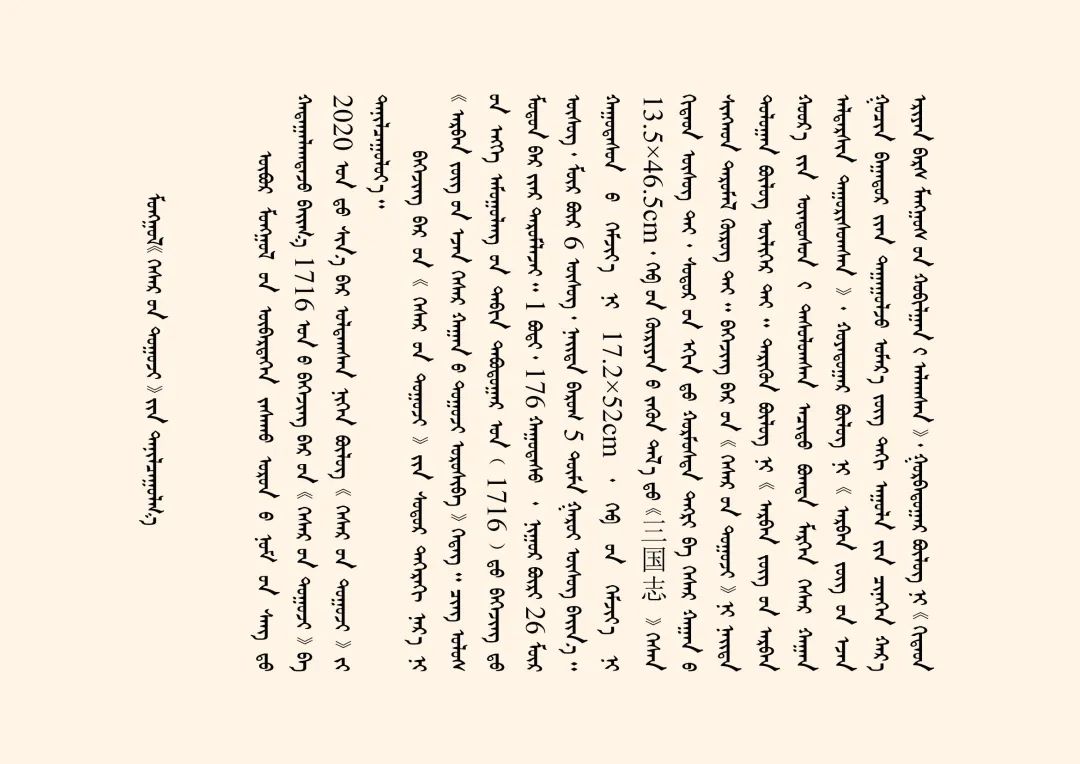 今天我們主要講述的是1716年北京木刻本蒙古文《格斯爾傳》(全稱為《十方圣主格斯爾可汗傳》)是清康熙五十五年(1716)北京木刻本。梵夾裝,1卷(176葉),每頁26行,每行6個字,約5萬多字,頁面高17.2cm、寬52cm,版框高13.5cm、寬46.5cm。版框左側有漢文《三國志》三字,首頁刻有朱印佛像。