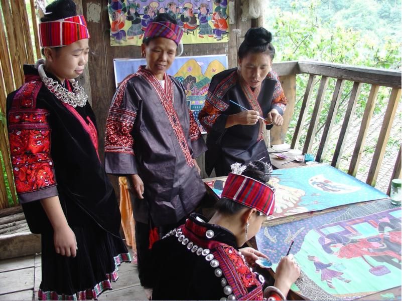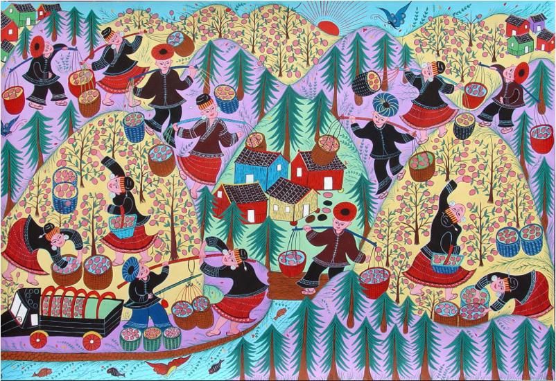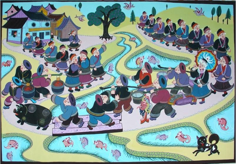 劍河現代民間繪畫源于傳統的苗族刺繡文化,是苗族刺繡文化的另一種表現形式和藝術升華。傳統的苗族文化多以服飾、歌舞為載體,并以刺繡及演唱等形式進行表現和傳承。早期劍河現代民間畫即脫胎于具有適用性的苗族刺繡樣稿——剪紙和手繪刺繡粉本,換言之,手繪的苗族刺繡粉本便是劍河現代民間繪畫的雛形,劍河第一批優秀的現代民間畫作者,即是原當地手繪粉本的能工巧匠。劍河現代民間繪畫多以苗族神話傳說中的故事情節和民俗節日、生產活動等內容為題材入畫,素材涵蓋自然界花鳥蟲魚及人物、家畜等具體形象,造型稚拙天真,設色濃艷,對比強烈。作品傳達出典型的地域民俗氣息及濃厚的鄉土味,便是其標志性特征。