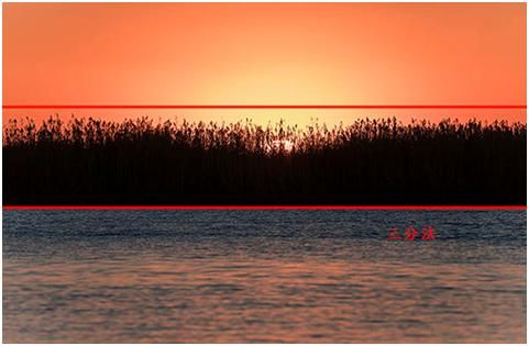 有的人可能就會問,地平線或者海平面的這個線,到底是放在哪條線上比較合適呢?主要原則可以稱為“頂天立地”,如果地面上的內容比較精彩的,就把這個地平線放得高一些,就是放到上面的1/3,也就是從上面數的第一條線上。如果天空的內容比較精彩的,比如說日出日落、彩霞滿天,地平線就放得低一些,放在最下面這條線上。