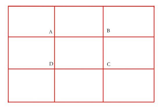 井字形構圖和黃金分割法構圖是什么意思呢?就是在拍攝的時候,拍攝主體也就是興趣點,根據現場的情況,放在這ABCD這四個位置上,這樣看起來畫面是比較舒服,是比較協調的,比如說你拍攝一個人,人頭應該是在交叉點上。
