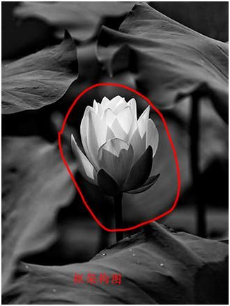 這張荷花改成黑白色調后,荷葉、荷花形成了巨大的反差及包圍的氛圍,也屬于框架式構圖形式。