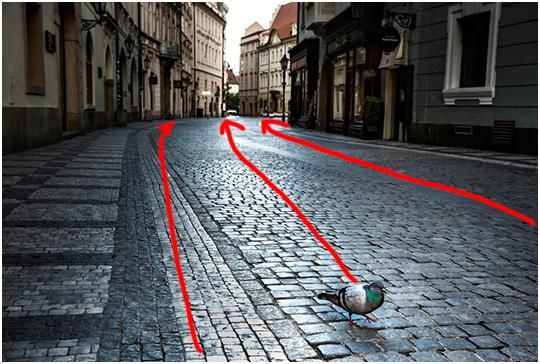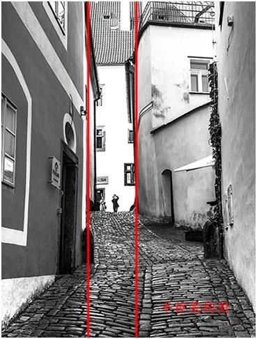 這張圖是布拉格阿的一個早晨,大概是早上五點多鐘,路上很安靜,天開始蒙蒙亮,我就拍了一張很安靜的街道,首先看到的興趣點是一只鴿子。路面形成的引導線以及通過路面反光形成的引導線來達到的,把目光從這只鴿子引向遠方。