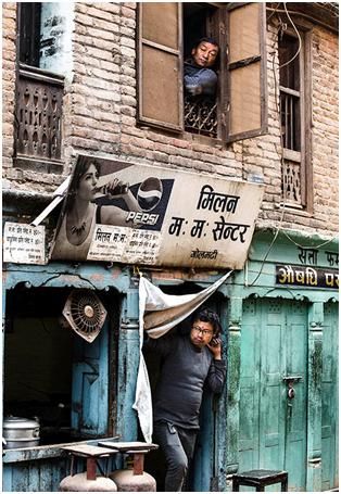 上面這兩張圖第一張,歸類為半包圍。第二張圖也是半包圍,在尼泊爾的一個小鎮拍的,旁邊兩個人是背影,實際上把這個人夾在中間,所以這個人特別容易引起你的注意,形成了一種包圍趨勢,在電影的鏡頭語言中運用的比較多。