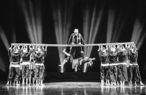 在靜謐的夜空下,首先映入觀眾眼簾的是群舞演員在舞臺中央,用身體構建的人字形“情人房”。房內的瑤族姑娘正在小憩,或許是被屋外的動靜驚醒,她推門出外察看,重重的門軸聲劃破了夜的寂靜,原來是愛慕者正攀在一根竹竿上向自己示愛。“無竹不成瑤”,舞蹈伊始,最核心的道具——一根長約8米、杯口粗的竹竿就出現了。借助竹竿,群舞演員通過造型組合及隊形變換,不斷再現生活場景:山坡上、小橋上、屋檐下、窗欞邊……情隨景遷、情景交融,生活圖景和人物情緒巧妙地融合在一起,營造出一種別樣的意境,極大地引發了觀眾的聯想。