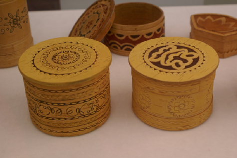 鄂溫克族的雕刻包括骨刻、木刻與樺樹皮刻。骨刻的工具是鐵制刻刀。骨刻制品一般有筷子、衣扣、板指、使用馴鹿時所用鞍子的配件、縫衣物時為拉緊線而用的拉線棒等,不同的用具上刻有不同的花紋。木刻的工具也是鐵制刻刀。木刻一般多用于神像、刀柄、煙鍋和白樺木制的馴鹿鞍具、背夾上。一般的花紋有“奧豪爾”,這種花紋有勾有彎,仿松樹形狀,有馴鹿不會跑掉的意思。背夾上的花紋則是犭罕 、馴鹿、松鼠、天鵝等。樺樹皮雕的工具用犭罕骨制成的刀,分二、三、四齒幾種。雕刻時,先用小刀或錐子把圖案輕輕畫在樺樹皮上,再用犭罕骨刻刀耐心地刻出花紋圖案。圖案一般有云卷紋、菱形紋、水波紋、花鳥等。用顏料涂上藍、紅色,使圖案呈現出色彩對比和立體感。鄂溫克族樺樹皮制品有盆、碗、盒、桶、箱等多種多樣,其制品本身就是非常古樸風雅的藝術品,再雕刻上各種花紋圖案,倍添精致、美觀。