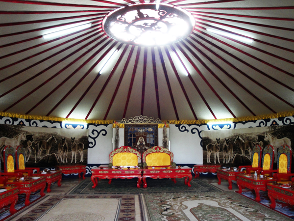 早先,蒙古人逐水草遷移,以氈帳為居室,所以蒙古人對制作氈帳有很高的技術。當地牧民的氈帳用白毛氈覆蓋,毛氈上面涂以石灰或白粘土和骨粉,使之更為潔白,有時也把毛氈涂成黑色。覆蓋在天窗周圍的毛氈,飾以各種圖案,門口懸掛著繡有各種顏色圖案的毛氈。大汗及諸王的氈帳則涂上金色,舉行宴會的氈帳可容納2000人。金帳之稱謂也由此而來【老鐵供圖】。
