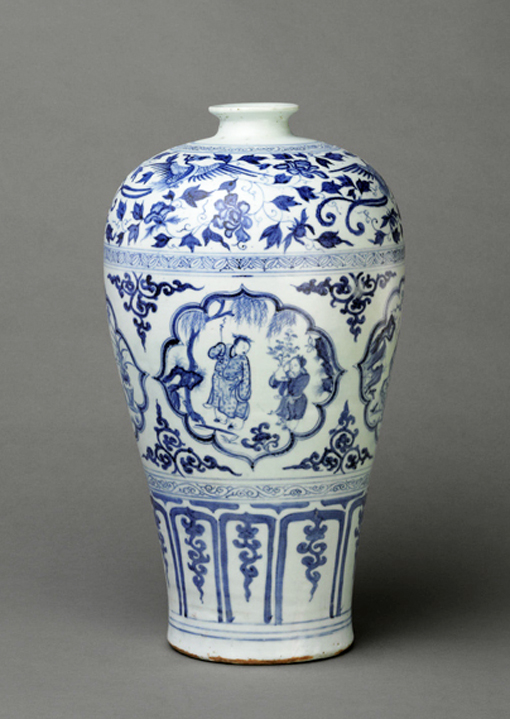 裝飾繁密是典型元青花的重要特點,它們由細巧的文化組成若干條帶環繞器身,裝飾帶數量通常很多,但惟獨沒有7層的,因為這個數字和蒙古族的喪葬與元代的刑罰有關。相反,9層裝飾帶的元青花卻為數不少,而這與蒙古族重九顯然有著直接的聯系【圖為元代后期青花四愛圖梅瓶。湖北省博物館藏】。