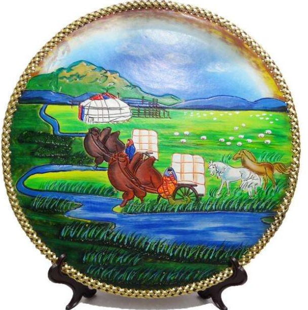 蒙古皮畫,精選草原天然優質牛皮經過特殊描繪、著色、層染、拋掐光、定形,半浮雕凹凸壓制等一系列工藝、幾十道工序,純手工制做完成。充分利用和展示了天然皮革所具有的皮質皮色,具有線條流暢,構描圖別致,立體感強,色彩柔和等特點,給人以全新的藝術享受。