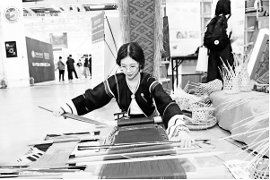 2021年5月,在第六屆全國大學生藝術展演活動現場,海南師范大學學生展示黎族腰織機織錦技藝。第六屆全國大學生藝術展演活動組委會供圖