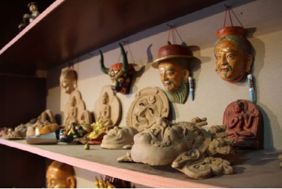 在普布次仁所在的公司里,有一個專門用來制作泥塑面具的房子,從外表上看去,它只是一個普普通通的藏式民居,但走進(jìn)其中,則別有一番天地。在房間里整齊擺放了大大小小的泥塑面具、佛像,這些手工藝品造型生動,每一件手工藝品仿佛都在訴說著一個古老、動人的故事。