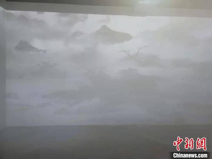 《西山雨觀圖》則將觀賞者帶進一個煙云縹緲的“人間仙境”,動態書法視覺與靜態山水相互映襯,一動一靜,讓人頓生超脫凡俗之感。置身其中,峰巒連綿起伏,山間云霧出沒,林木層疊,村莊、湖泊、小橋被籠罩在煙靄之中。煙云渺渺,山峰若隱若現,獨立而交織,詩意盎然。
