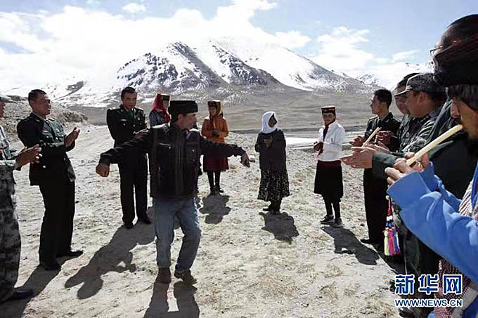 拉齊尼·巴依卡和邊防戰士一起與當地牧民群眾聯歡。(新華社記者 李翔 攝影)