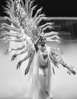 在敦煌舞的動作素材積累方面,無論是對敦煌壁畫舞姿的歸類、整理,對“敦煌舞特有的S型曲線運動規(guī)律”的發(fā)現(xiàn),以及“運用中國古典舞蹈的節(jié)奏韻律,把靜止的姿態(tài)與其風格統(tǒng)一的動作過程結(jié)合起來,形成比較完整的舞蹈運動和造型體系”,還是在創(chuàng)作層面上《絲路花雨》對“反彈琵琶”典型壁畫舞姿的發(fā)展,《千手觀音》對“千手”舞姿造型的無限變化發(fā)展,以及《飛天》超越人體動作范圍極限對“三道彎”典型敦煌舞姿風格的強化等,都是敦煌舞在動作素材層面的積極建設(shè)和發(fā)展。