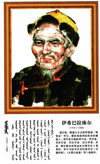 伊希巴拉珠爾(1704~1788),蒙古族,一名也協(xié)班覺、額爾德尼班智達(dá)·松巴堪布,蒙古衛(wèi)拉特人,著名蒙醫(yī)學(xué)家、文學(xué)家、天文學(xué)家哲學(xué)家。一生著作豐厚,其中對(duì)完善蒙醫(yī)理論體系有重要影響的著作有《甘露之泉》、《白露醫(yī)法從新》、《甘露點(diǎn)滴》、《甘露匯集》和《認(rèn)藥水晶鑒》,在這些著作中他將藏醫(yī)學(xué)理論與蒙古人的體質(zhì)、生活習(xí)俗、居住地區(qū)的地理、氣候條件等具體實(shí)際結(jié)合在一起,進(jìn)行創(chuàng)造性的理論研究,不僅豐富了臨床實(shí)踐的內(nèi)容,而且補(bǔ)充和完善了蒙醫(yī)學(xué)的理論體系,他將傳統(tǒng)蒙醫(yī)學(xué)“寒熱理論”與《四部醫(yī)典》中關(guān)于寒熱病理論的闡述進(jìn)行有機(jī)結(jié)合,使之成為近代蒙醫(yī)學(xué)病性辯證的總綱,同時(shí),他也闡述了將六基癥作為病因鑒別診斷的核心及其臨床表現(xiàn),使“六基癥”學(xué)說從理論到實(shí)踐都獲得了比較系統(tǒng)的發(fā)展。占布拉道爾吉是19世紀(jì)著名的蒙藥學(xué)家,他編著的《蒙藥正典》(又名嗚嗚蒙藥圖鑒)共收載蒙醫(yī)臨床常用藥物879種,按礦物、植物和動(dòng)物等分為8部24類,附插圖576幅,對(duì)每種藥物的產(chǎn)地、形態(tài)、性味、功能、入藥部分、采集加工、炮制方法、主治、用法等都闡述詳盡,并且每一味藥物都標(biāo)寫了蒙、藏、滿、漢四種文字的藥名,具有很高的參考價(jià)值。該書還附有外科術(shù)療器具圖解,以及放血穴位、針灸穴位、人體各部分劃分圖解說明等。敏如爾古布拉(1789-1838)編撰了蒙醫(yī)學(xué)方劑巨著《方海》,是一部比較系統(tǒng)完整的蒙醫(yī)藥物方劑學(xué)經(jīng)典著作,收載方劑近200種,分為76章,進(jìn)行詳盡的論述和評(píng)點(diǎn),同時(shí)對(duì)相關(guān)疾病的病因、病機(jī)、分類和治法等也做了簡要論述。