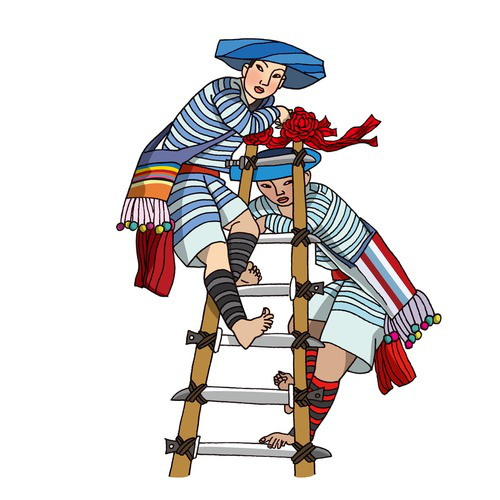 傈僳族(上刀桿):傈僳族有574856人,聚居在云南省怒江傈僳族自治州,迪慶、德宏等州亦有分布。傈僳族傳統體育項目是射弩,蕩秋千、過溜、摔跤、快速砍竹子、上刀桿、泥彈弓、溜索、游泳等。